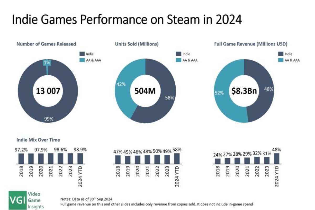 Solo per quanto riguarda il denaro i grandi tripla-A hanno ancora un vantaggio, almeno per il momento. Si parla infatti degli 8.3 biliardi che ha incassato tutta l’industria nel 2024 infatti “solo” il 48% è andato agli studi indipendenti, con tripla-A e doppi A che hanno per ora il 52% del mercato. I numeri però sono in crescita e il tempo è poco: è chiaro il trend.