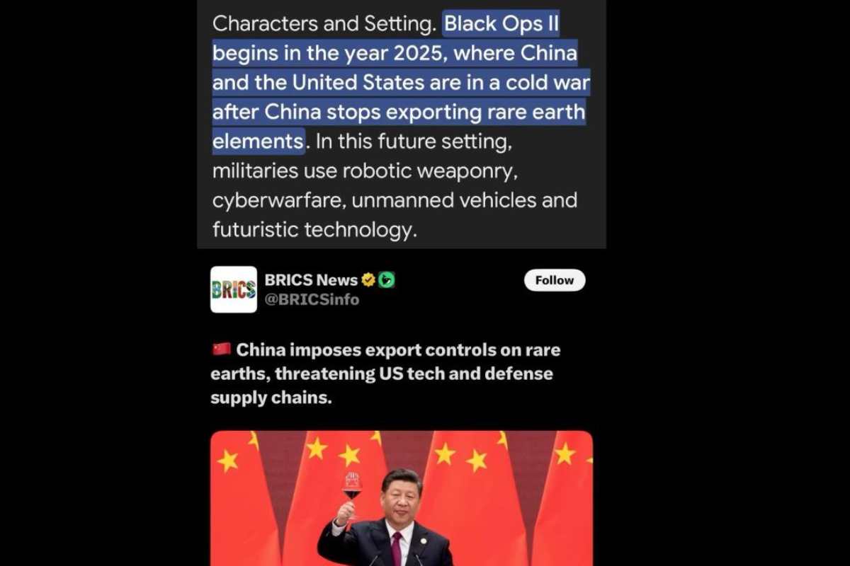Il post è uno screenshot che mette insieme un altro messaggio apparso su un altro profilo del social che una volta era dell’uccellino azzurro che riguarda la Cina che chiude i rubinetti dei minerali rari agli Stati Uniti e giustapposto a quella che è la sinossi proprio di Call of Duty: Black Ops 2.