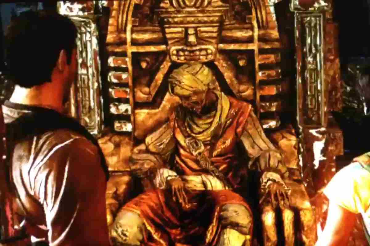C’è infatti una scena che si attiva solo e soltanto se state proseguendo nell’avventura a difficoltà crushing. Se ve la sentite di accendere PS Vita (vi mancano le console portatili?) e di giocare fino a raggiungere il Golden Abyss del titolo potete trovarvi in qualcosa che sembra uscito da un film. Nathan e Marisa si trovano infatti in un’area costruita appositamente per una cutscene. I due personaggi si avvicinano lentamente a quello che sembra il corpo di un uomo seduto su un trono, vestito con abiti orientali.