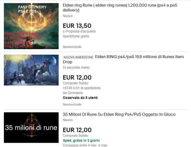 Tanti utenti di Elden Ring si sono infatti lamentati che il gioco prodotto da FromSoftware è troppo difficile, da qui la necessità di fare upgrade rapidamente. Ma, ve lo diciamo subito a rischio di darvi qualche spoiler, ci sono dei sistemi sicuramente meno pericolosi per il portafoglio per poter guadagnare rune, letteralmente mentre dormite. Vi basta cercare “Elden Ring rune farming” su YouTube e verrete accontentati. Da parte nostra non avalliamo né un modo nè l’altro, i videogiochi devono essere una forma di intrattenimento e non sono di certo una gara a chi arriva prima. Ma se siete tra quelli che pensano che un aiutino non faccia male, concentratevi sulle attività lecite e lasciate stare le rune in vendita su eBay.