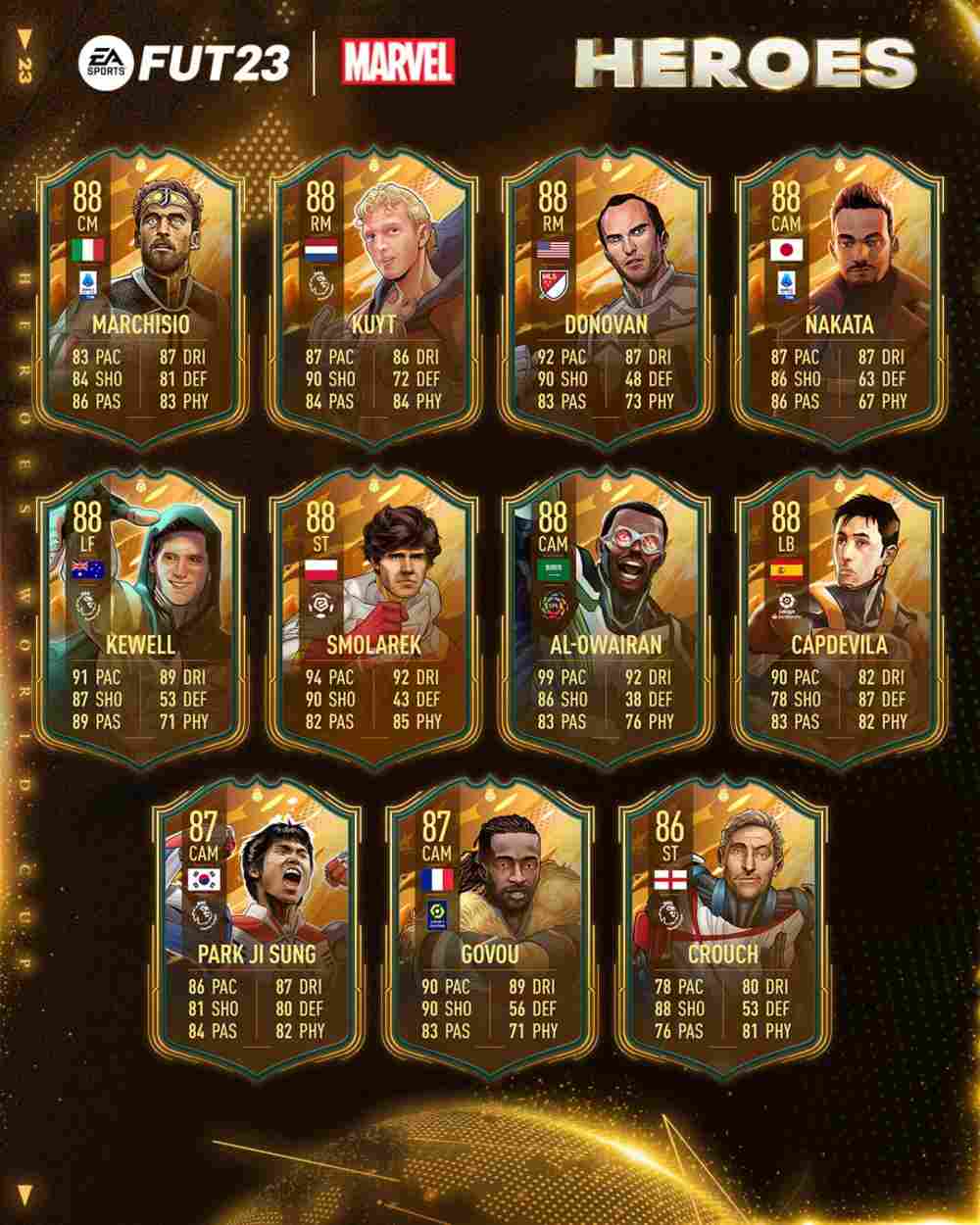 Pariamo ovviamente delle carte FUT Marvel Heroes, ovvero delle carte speciali nate dalla collaborazione tra EA Sports e Marvel. Alcuni dei giocatori più iconici di questo sport sono stati reinventati come supereroi, con una grafica molto particolare e delle carte davvero speciali. Di seguito la lista completa, in basso le foto delle carte con tutte le caratteristiche.