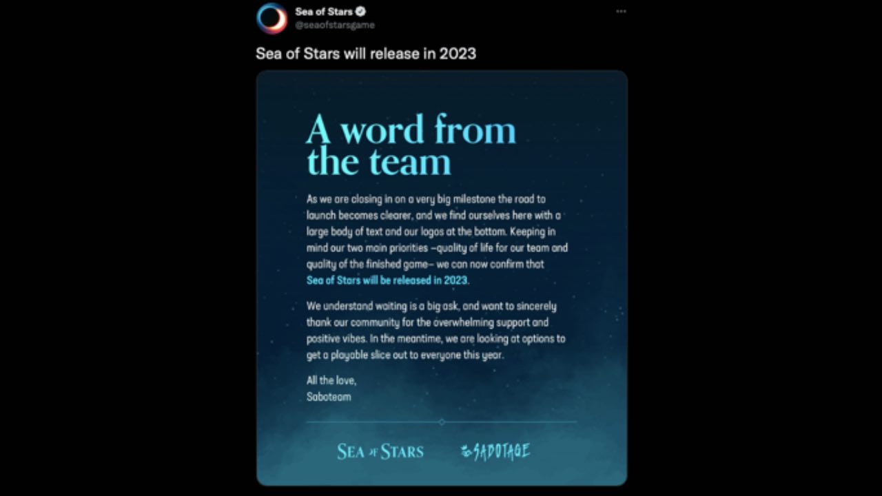 “Dando priorità alla ‘qualità della vita per il nostro team e alla qualità del gioco’, Sabotage Studio rilascerà Sea of Stars più tardi del previsto. Il team ringrazia i fan per il loro ‘supporto travolgente e vibrazioni positive’ e anticipa che potrebbe rilasciare una ‘fetta giocabile’ più avanti nel 2022”. Alla fine di tale comunicato, inoltre hanno aggiunto che possa riguardare solo gli utenti per PC. Ma hanno anche concluso dicendo che, chiunque, deve rimanere con le orecchie drizzate.