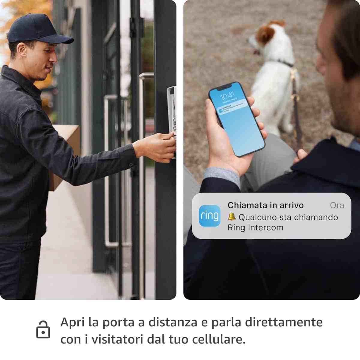 Dall’altra parte invece c’è il rivoluzionario Ring Intercom. Una piccola scatoletta che viene installata vicina al tuo citofono di casa e che permette, usando il proprio smartphone, di ricevere notifiche quando veniamo citofonati, di rispondere e di controllare tutto stando comodamente seduti sul divano di casa.
