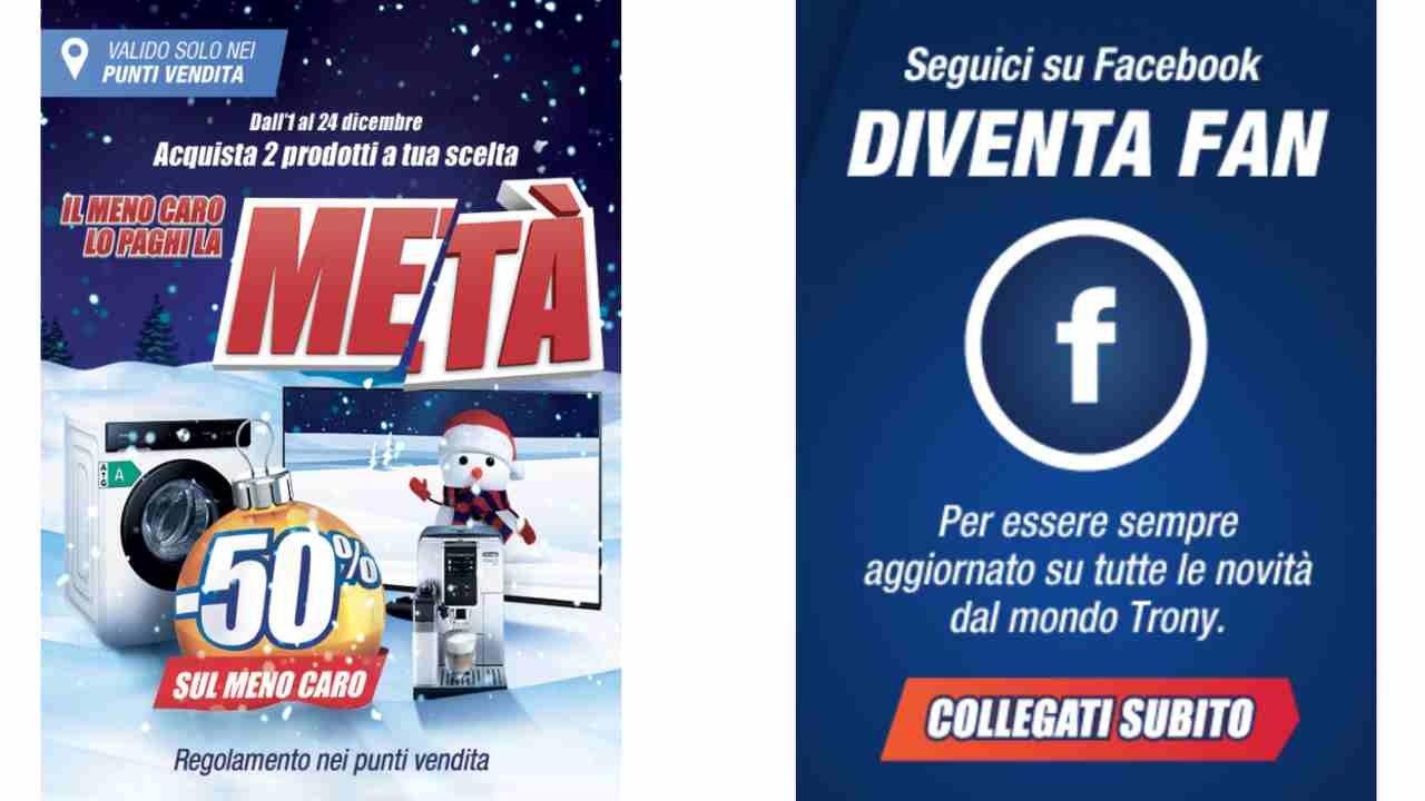 Fino alla vigilia di Natale, Trony propone tantissimi prodotti del proprio catalogo con sconti promozionali al 50%, con un modello collaudato: ovvero, acquistando due prodotti, il prezzo del prodotto meno caro verrà dimezzato. Tra le categorie merceologiche: informatica, grandi e piccoli elettrodomestici, televisori e telefonia. Scopriamo i dettagli.