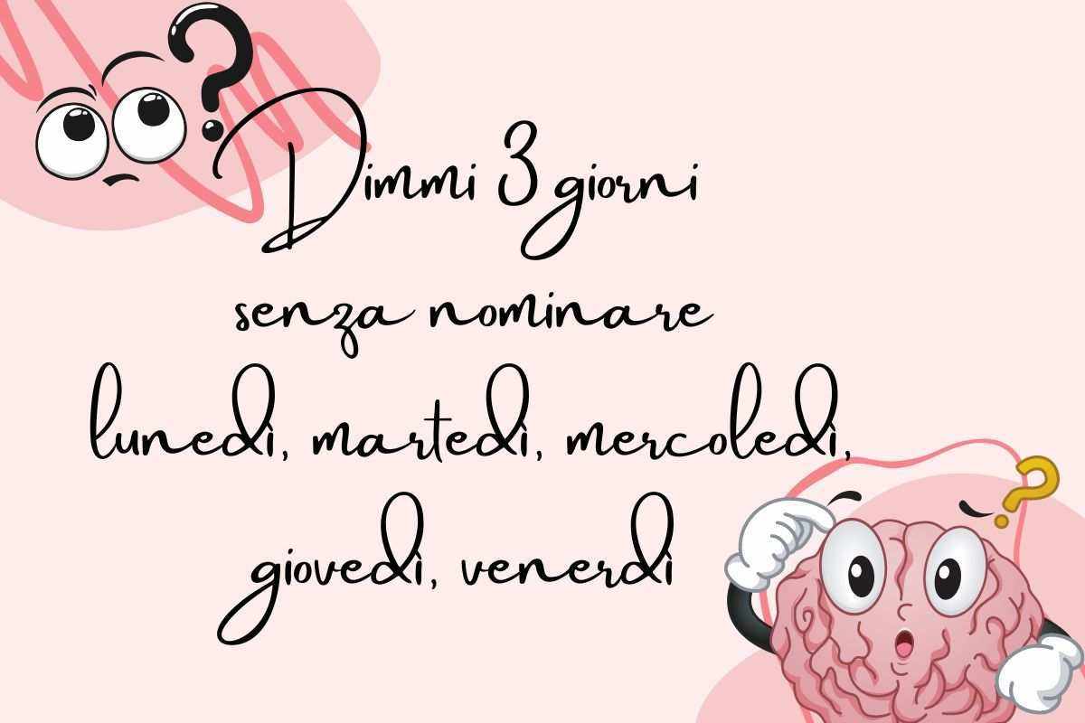 E se siete appassionati di indovinelli, allora ve ne vorremmo proporre qualcuno di veramente speciale. Ci riferiamo alla domanda che viene posta nella prima foto dell’articolo, in cui ci viene chiesto di nominare tre giorni della settimana escludendo lunedì, martedì, mercoledì, giovedì e venerdì. Anche in questo caso la risposta non è facile, ma attenzione: la logica potrebbe aiutarci a risolvere il test più velocemente del previsto.