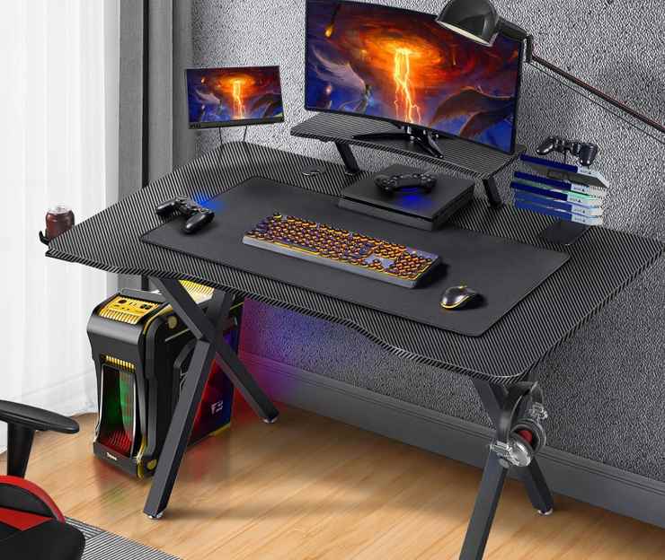 Sebbene questa Yaheetech sia tra le migliori scrivanie da gaming un modello economico, in realtà è un prodotto di assoluta affidabilità che si trova spesso anche in sconto su Amazon. Costruita in legno ingegnerizzato, strizza l’occhio anche all’ambiente con pannelli in MDF durevoli e rivestiti poi di impiallacciatura testurizzata in quello che è un tessuto molto resistente di carbonio in grado di essere impermeabile, resistente ai graffi e anche facile da pulire. La struttura è robusta e, sebbene sia più piccola della precedente con i suoi 111×71 cm, la portata è comunque di 90 kg. Tra gli accessori extra ci sono ai lati da una parte il gancio per le cuffie mentre dall’altra un porta-bicchieri, senza dimenticare un utile supporto per ricaricare i vostri dispositivi portatili oltre a un piccolo scaffale dove posizionare videogame o libri.