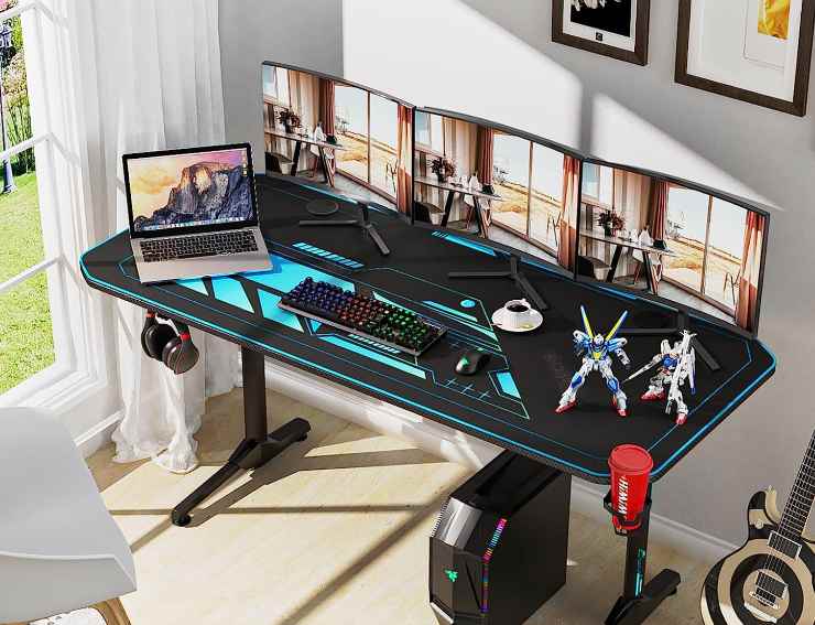 La Hlonone è tra le migliori scrivanie da gaming quella con le luci a led, degli appariscenti faretti colorati sui suoi bordi che rendono la scrivania una postazione dinamica e immersiva, ma anche stilosa per eventuali opportunità di streaming; si tratta di quattro gruppi di strisce luminose RGB sul lato destro e altrettante su quello sinistro, inoltre il telecomando in dotazione vi permetterà anche di personalizzarle con colori e pattern. Le dimensioni sono 120×60 cm e vi offrono la possibilità di avere margine di manovra sia per posizionare i vostri monitor che per giocare liberamente. Tra gli accessori in dotazione ci sono un gancio per cuffie, un porta-bicchieri e un tappetino per mouse oversize.