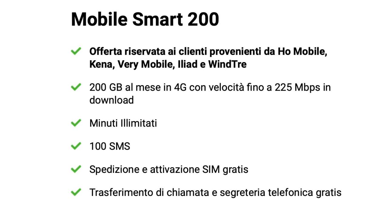 Tiscali ha dedicato l’offerta ai nuovi clienti precedentemente attivi con altri operatori mobili e, nello specifico, provenienti da Iliad, WindTre, Very Mobile, Kena e ho. Mobile. Smart 200 prevede dunque la portabilità del proprio numero, acquistando una nuova SIM al costo di 10,00 Euro a cui si aggiunge la somma della prima ricarica da 8,99 Euro, se effettuata online, oppure da 10,00 Euro, se effettuata nei punti vendita.