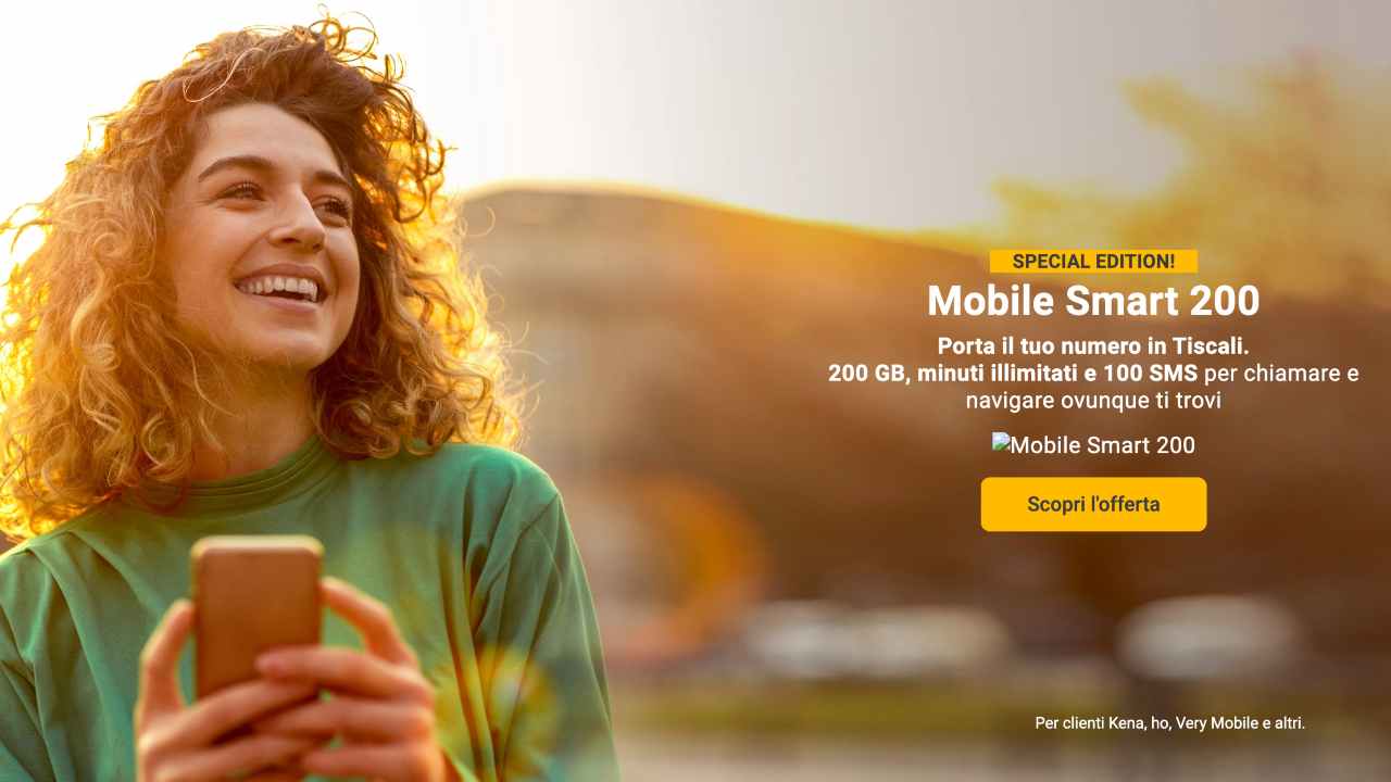 L’operatore virtuale di telefonia mobile Tiscali ha lanciato l’offerta Smart 200, sottoscrivibile sia online sia nei punti vendita fisici sparsi sul territorio nazionale. Include minuti illimitati verso tutti i numeri nazionali, mobili e fissi, 100 SMS e 200 GB di navigazione su Internet in 4G, al costo di 8,99 Euro al mese con ricarica automatica.