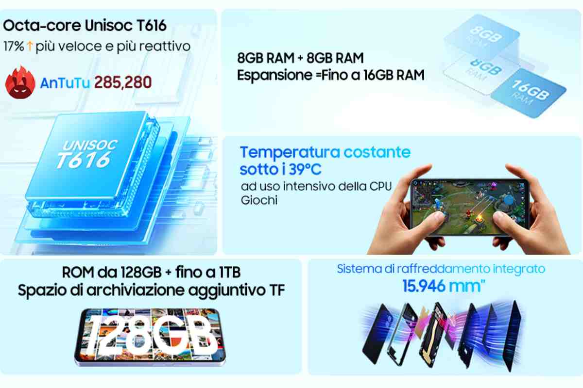 Il dispositivo ha uno schermo da 6.75 pollici con tecnologia HD+ Incell molto brillante che rende ogni immagine spettacolare. Sotto la scocca batte un potente processore Unisoc con 8 GB di RAM fissa e 8 GB di RAM virtuale, oltre a 128 GB di memoria per il dispositivo, che può essere estesa fino a 1 TB.