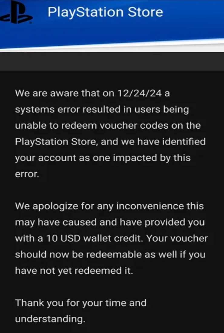 Online tanti giocatori stanno condividendo un’email ricevuta da Sony, che si scusa per un “errore di sistema” che “ha impedito agli utenti di riscattare i codici voucher sul PlayStation Store”. La compagnia afferma di aver identificato gli account colpiti dall’errore e di aver aggiunto 10 dollari ai loro portafogli. Purtroppo questo non vale in Italia dato che qui non ci sono stati problemi tecnici, ma solo per gli USA.