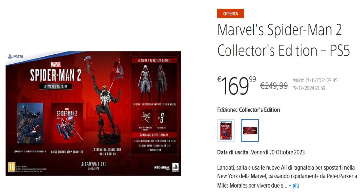 Il prezzo di questa Collecor’s Edition su eBay è di circa 250-300 euro per quelle che sono già state aperte e sono prive di gioco. Ora invece è possibile fare l’acquisto sul Playstation Store ufficiale e farsela spedire a casa per appena 170 euro sfruttando le nuove offerte Playstation. Tutto però fino ad esaurimento scorte e fino al 19 dicembre 2024.