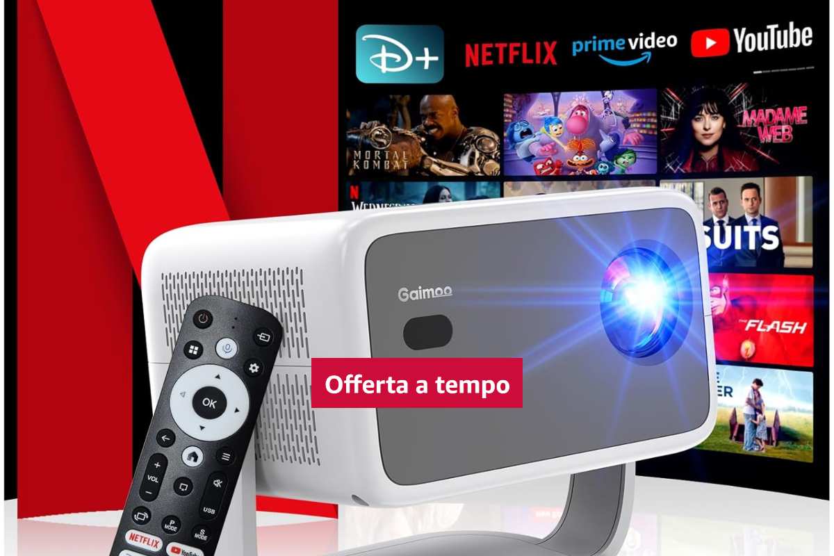 L’offerta in questione è firmata Amazon e riguarda un proiettore Gaimoo GM700 4K. Un dispositivo dotato di base rotante e di supporto che permette qualsiasi angolazione, persino di proiettare sul soffitto e farci guardare qualsiasi cosa mentre siamo distesi. Tramite l’autofocus avremo sempre risultati eccezionali.