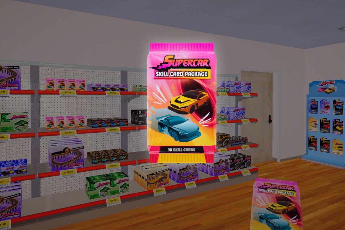 In Supercar Collection Simulator l’ambiente di gioco non è un sottoscala ma una sala in cui è possibile far correre i propri modellini su percorsi che riguardano effettivamente le piste delle Micro Machines. E oltre a collezionare carte, tutto il titolo ruota intorno alla costruzione del proprio negozio.