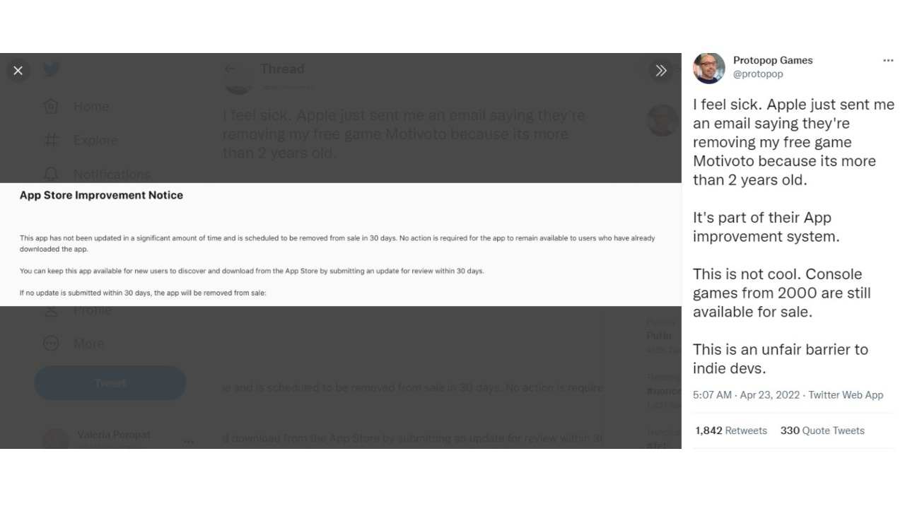 Ma adesso a quanto pare se avete deciso di pubblicare il vostro videogioco sull’Apple Store e non lo avete coccolato con aggiornamenti rischiate grosso. Ecco che cosa è successo secondo i racconti che arrivano da Twitter.