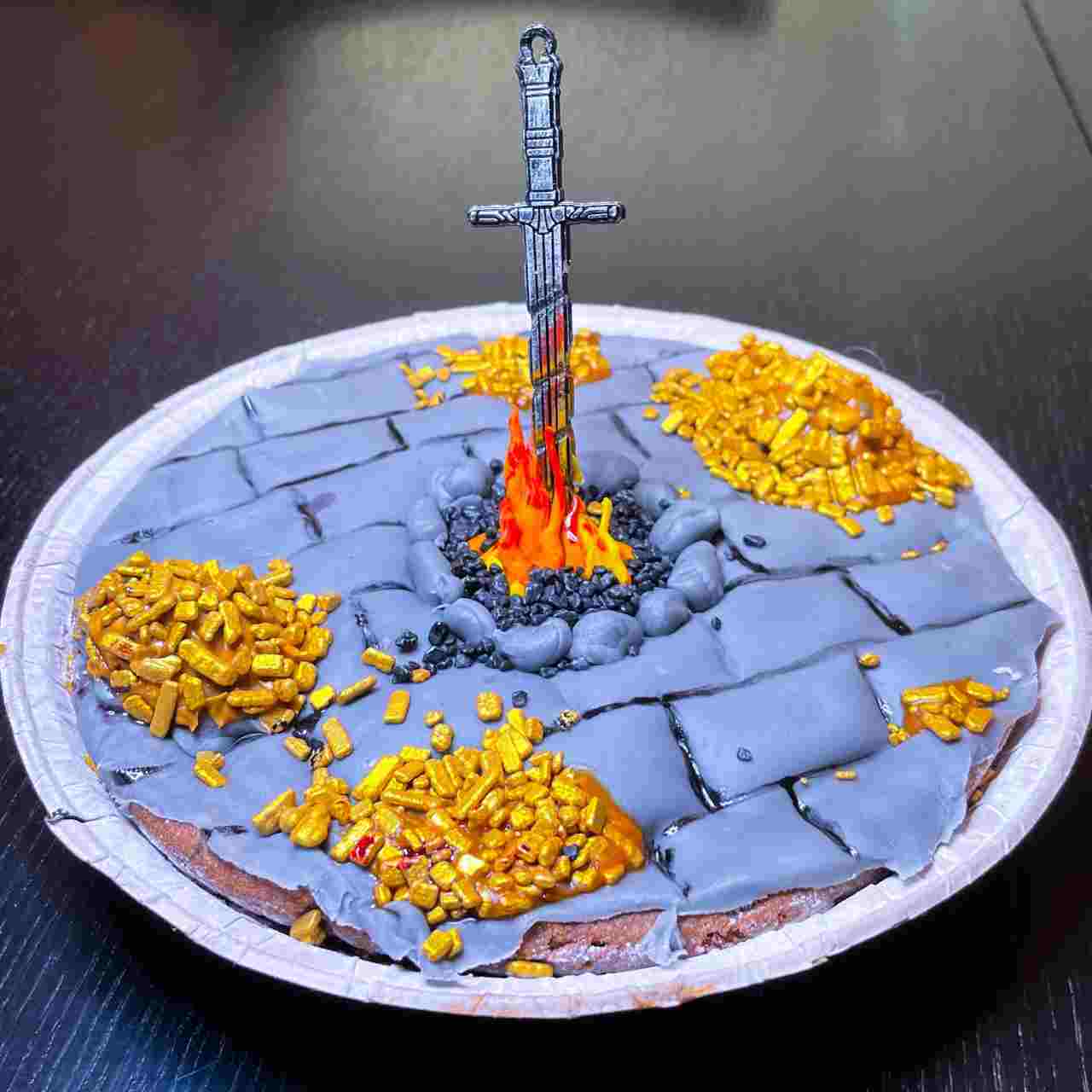 Con una montagna di pasta di zucchero, il giovane pasticcere ha ricreato il bonfire iconico del terzo capitolo della saga di FromSoftware circondato da mucchi di lingotti d’oro modellati uno per uno e glassati per renderli ancora più lucidi e plausibili. Certo la torta non sembra troppo lievitata ma la perizia nella decorazione basta per far scattare l’applauso. Su Reddit non manca chi si lascia andare a commenti meschini ma basta saltarli a piè pari e concentrarsi su chi invece decide di farsi qualche risata con il ragazzo e suo padre piuttosto che alle loro spalle, giocando sulle “pie” e “lie”.