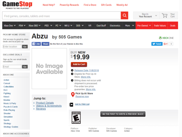 Sviluppato da Giant Squid, Abzu è al momento disponibile solo su PC e PS4. Una situazione che potrebbe cambiare molto presto, almeno stando al catalogo del sito internazionale di GameStop.