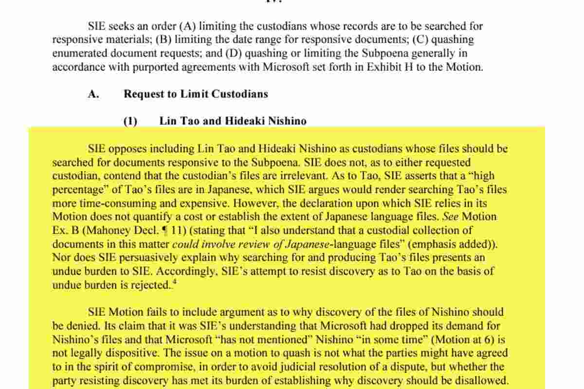 Una delle richieste più recenti fatte da Microsoft per perorare la propria causa e dimostrare come in realtà Sony si lamenti della possibilità che si generi una situazione in cui in realtà si trova essa stessa da molto tempo è quella relativa agli accordi che la società giapponese ha stipulato nel corso degli ultimi anni con i publisher di terze parti. Sony ha risposto di non aver problemi ma che sarebbe meglio evitare di fornire questi documenti a causa della lingua in cui sono scritti.