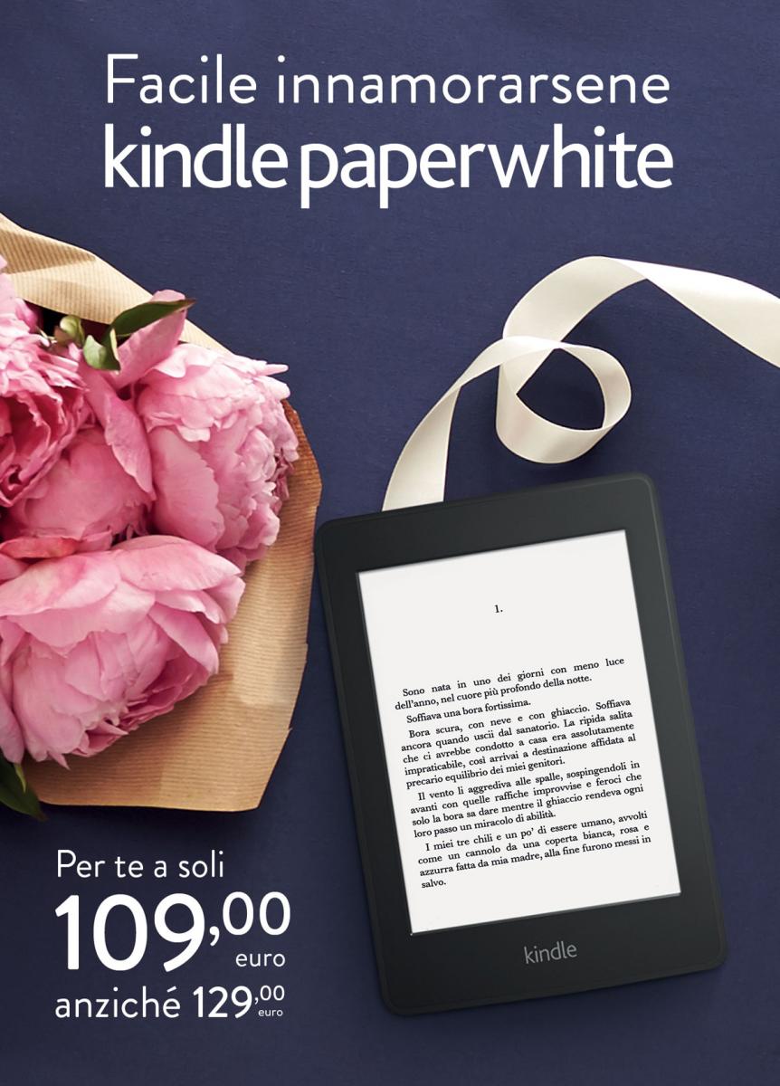 Se la vostra dolce metà ama leggere, potreste prendere in considerazione l’idea di regalargli/le il Kindle Paperwhite in occasione di San Valentino. Amazon infatti, per la festa degli innamorati, sconta il dispositivo di 20 €: così, se lo acquisterete entro il 14 febbraio avrete la possibilità di sborsare 109 € anziché 129.
