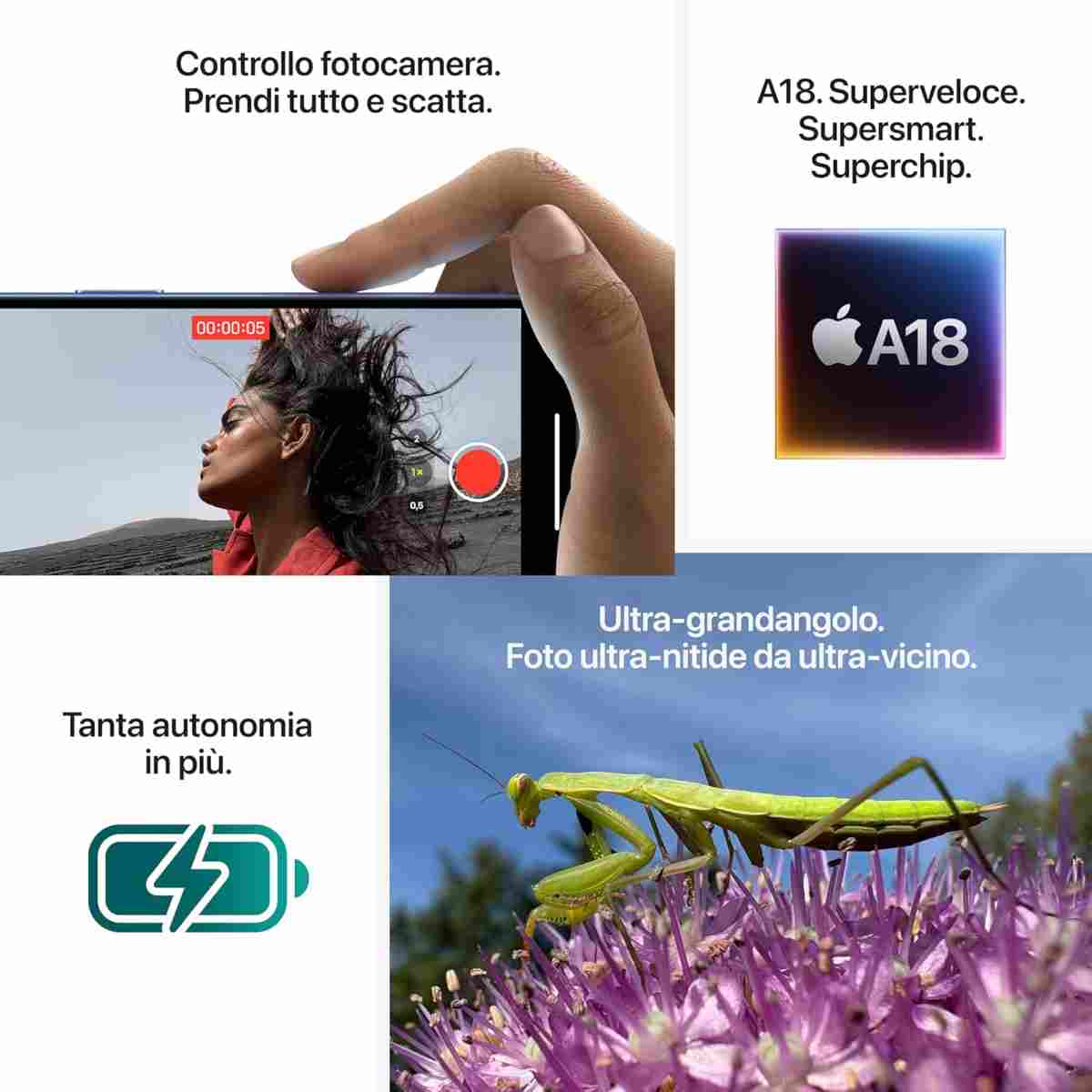 Sotto la scocca in alluminio resistente batte un chip A18 di ultima generazione che è molto più potente dell’A16 Bionic del modello precedente. Tramite questa componente è possibile avere un’esperienza di uso di primissimo livello, senza blocchi.