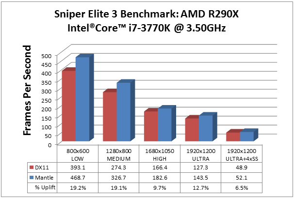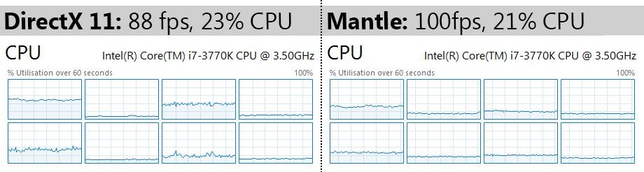 Visti gli indubbi vantaggi apportati da Mantle i ragazzi di Rebellion hanno deciso di fornire il supporto per le nuove librerie anche sul nuovo Sniper Elite III; ma vediamo all’atto pratico in cosa si traduce questa scelta. Sul Blog AMD abbiamo trovato una rapida analisi prestazionale che mostra l’incremento raggiungibile con Mantle. Utilizzando una CPU Intel Core-i7 3770K con una scheda grafica Radeon R9 290X, a risoluzione 1920×1200 con preset di dettaglio Ultra, i ragazzi di Rebellion hanno ottenuto un incremento di framerate del 14% e un carico della CPU decisamente più omogeneo rispetto alle DX11. In questo caso si tratta di dati rilevati in idle, ma che evidenziano comunque come l’influenza di Mantle si faccia sentire a livello di incremento prestazionale e soprattutto sullo sfruttamento delle capacità multitasking della CPU.