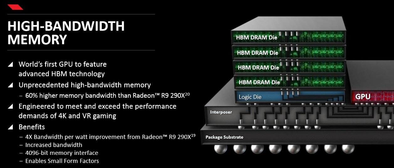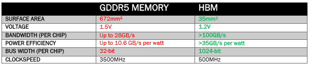 L’innovazione principale che è sicuramente degna di nota sono le memorie HBM (High Bandwidth Memory), in grado di garantire una banda passante superiore rispetto alle attuali GDDR5; i moduli di memoria sono assemblati uno sopra all’altro, occupano quindi meno spazio sul PCB e non necessitano di collegamenti dalla lunghezza troppo elevata, a tutto vantaggio del consumo di energia e della velocità di comunicazione. Idealmente possiamo aspettarci anche un ottimo margine di overclock. Ecco di seguito una tabella che riassume i vantaggi delle memorie HBM rispetto a quelle tradizionali, ed un’immagine che ne illustra il funzionamento ed i vantaggi: