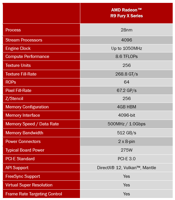 Diamo ora un’occhiata alle specifiche hardware della nuova Radeon FuryX: la GPU Fiji XT ha una frequenza di clock di 1050 MHz e dispone di 4096 stream processors, 256 Texture Units e 64 ROPs; la potenza di calcolo complessiva di questa scheda è di ben 8.6 TeraFLOPS. Ad affiancare la GPU Fiji XT troviamo 4GB di memoria HBM con interfaccia a 4096 bit e una banda passante di ben 512 GB/s; poco male se 4GB sembrano pochi, con una velocità del genere difficilmente si avranno problemi legati alla memory bandwidth. Qui sotto potete trovare le specifiche complete della nuova Radeon FuryX, ed una tabella di confronto con le analoghe soluzioni Nvidia e con la precedente top di gamma R9 290X.
