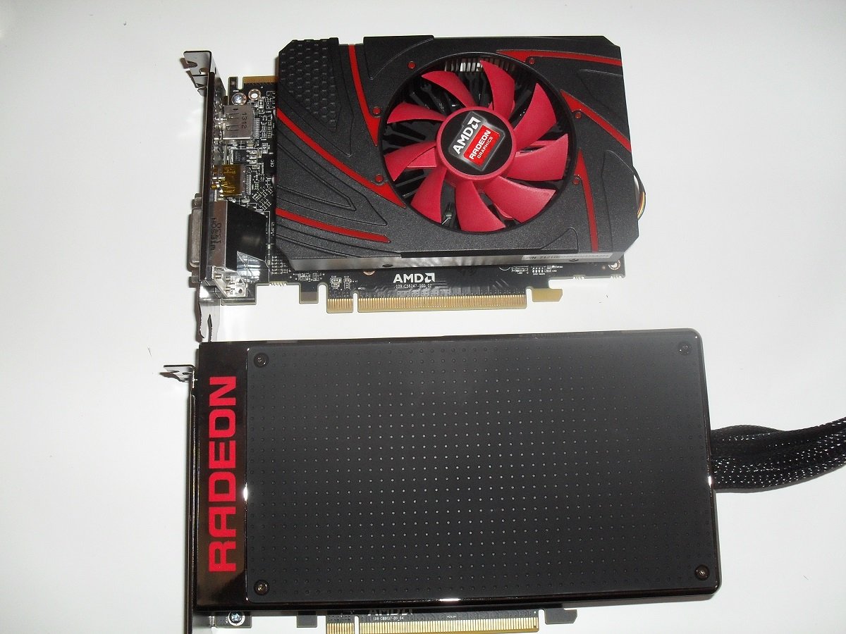 Un altro particolare che ci ha colpito positivamente sono le dimensioni della scheda: grazie alle memorie HBM, che sono installate direttamente sulla CPU, gli ingegneri di AMD hanno potuto contenere particolarmente le dimensioni; la nuova FuryX è infatti più corta del 30% rispetto ad una R9 290X stock, e poco più grande di una Radeon R7 260X, ovviamente escludendo il blocco di raffreddamento liquido. Questa caratteristica consente di installarla anche in case di dimensioni abbastanza compatte, come il nostro Cooler Master Elite K380. L’unico problema sarà trovare il posto per installare il dissipatore a liquido, se ne avete uno già installato.. ecco qui sotto il confronto tra le dimensioni della R7 260X e la FuryX.