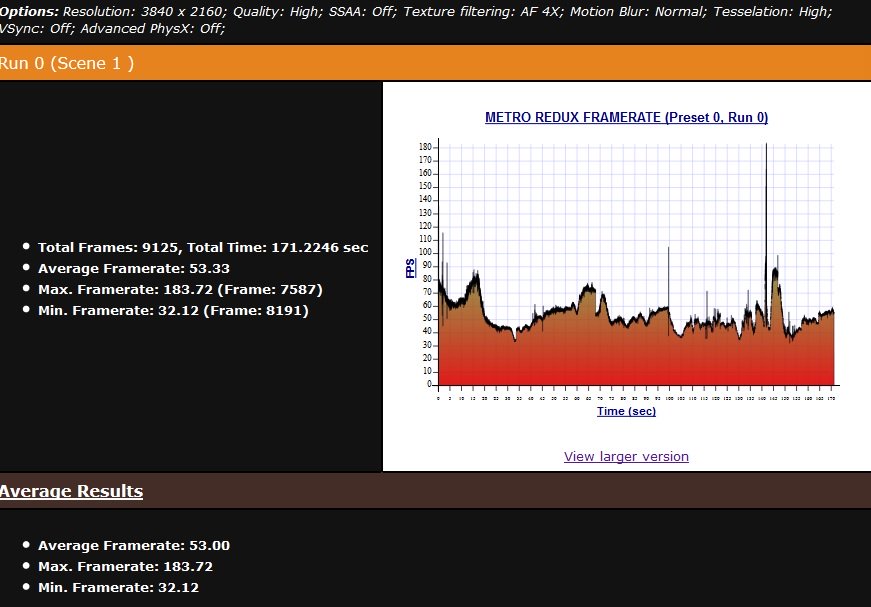 Metro Last Light è noto per essere particolarmente pesante a livello di grafica: per eseguire il test abbiamo utilizzato il benchmark integrato, impostando la risoluzione a 3840×2160, con preset High, SSAA disattivato e AF4x, ed attivando il Motion Blur e con la tessellation impostata su High. Il risultato che abbiamo ottenuto è buono, oltre 50 FPS medie con rallentamenti praticamente assenti. Tuttaviaper la massima fluidità è sufficiente disattivare il motion blur ed abbassare il livello della tessellation: con questi parametri è possibile anche attivare anche il SSAA, raggiungendo ben 104 FPS medie. Il consumo complessivo del nostro sistema con Metro LL Redux si attesta sui 400 Watt.