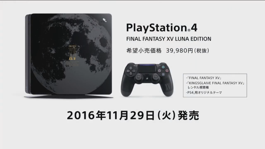 Square Enix e Sony hanno annunciato PlayStation 4 Luna Edition, una nuova variante del modello slim mostrato al PlayStation Meeting del 7 settembre a tema Final Fantasy XV.