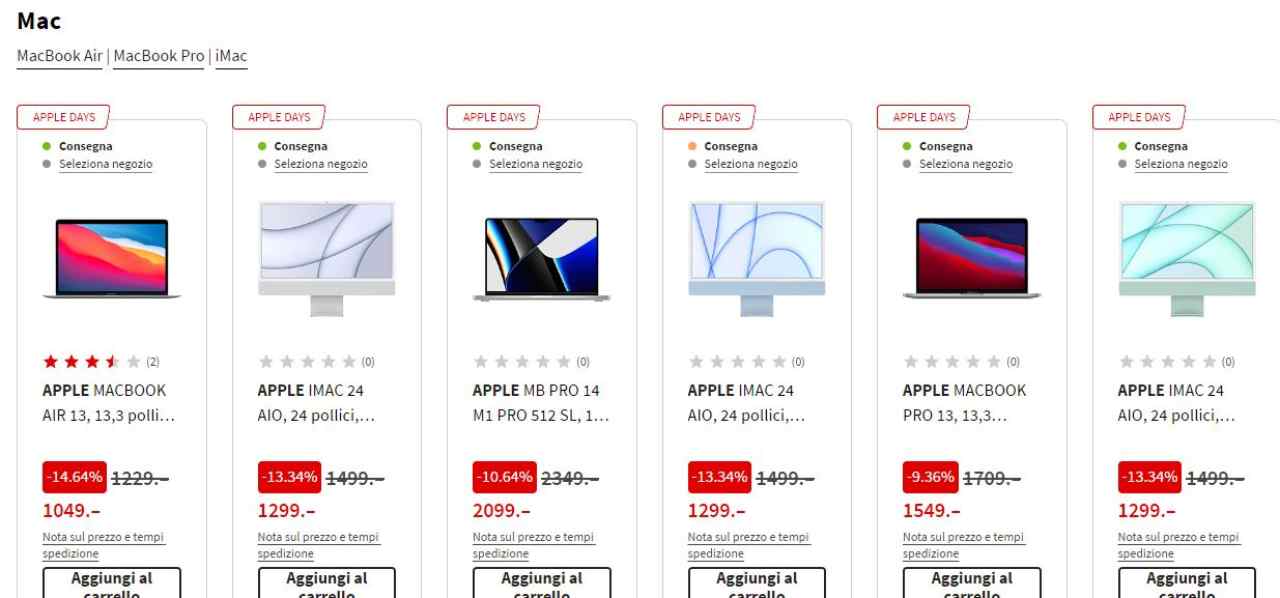 Ovviamente non possiamo elencarvi tutti i prodotti in sconto da MediaWorld per gli Apple Days, che ricordiamo, proseguiranno fino al prossimo 16 ottobre, di conseguenza non ci resta che lasciarvi alla pagina ufficiale della promozione che potrete trovare qui. Vi ricordiamo infine che la promo è valida sia online quanto negli store fisici di conseguenza avrete due diverse opzioni per tentare l’acquisto del vostro oggetto del desiderio: buona fortuna e buono shopping. Vi ricordiamo infine che è possibile acquistare i prodotti Apple anche con un comodo finanziamento a tasso zero fino a ben 30 diverse rate, di conseguenza potrete acquistare l’oggetto che più vi aggrada pagandolo una piccola somma ogni mese. Il minimo di spesa per il finanziamento è di soli 240 euro.