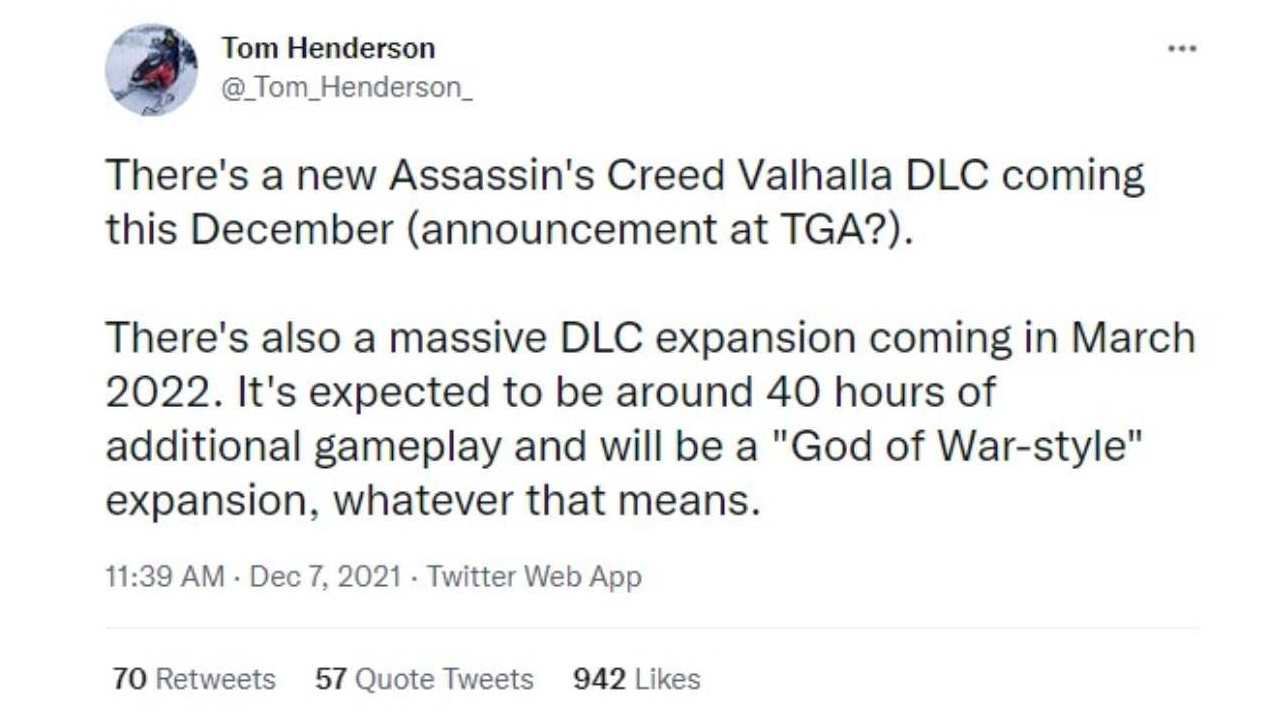Come succede sempre quando a parlare è Tom Henderson il messaggio parte da Twitter e noi è lì che siamo andati a leggere sia quello che il giornalista ha da dire sia le reazioni della community. Questo è il messaggio del giornalista: “C’è un nuovo DLC di Assassin’s Creed Valhalla in arrivo a dicembre (annuncio ai TGA?). C’è anche un’altra espansione DLC enorme in arrivo a marzo 2022. Dovrebbe essere circa 40 ore di gameplay aggiuntivo e sarà un espansione ‘stile God of War’, qualunque cosa significhi“.