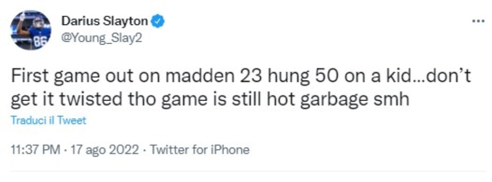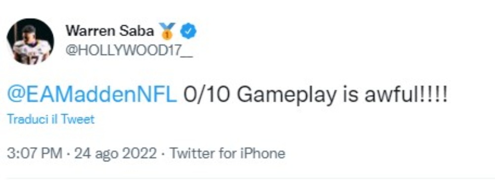 Oltre ai videogiocatori scontenti, anche i giocatori professionisti di football americano si lamentano di Madden 23. Darius Slayton dei New York Giants ha scritto di aver vinto un match con parecchi punti “Ma non fatevi venire strane idee, il gioco è spazzatura“. Mecole Hardman dei Kansas City Chiefs ha scritto “Questo potrebbe essere il peggior Madden di sempre”. Intanto vi segnaliamo come avere 17 giocatori oro rari e gratis su FIFA 23 FUT, e un cambiamento storico per quanto riguarda Twitch.