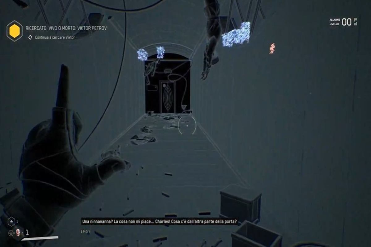 Attraverso Charles ed il potenziamento oculare che riceviamo proprio ad inizio gioco, possiamo accedre alla preziosissima funzione di scan. Mettendo la mano piatta e ad L, P-3 può vedere attreaverso i muri e meglio compendere la zona. Sappiate che questa è forse la funzione più importante del vostro aiutante, dato che vi permette continuamente di capire come muovervi. In blu il loot, in bianco gli oggetti con cui interagire, in arancione i nemici. Utilizzando questa funzione prima di entrare in una stanza, cadere da un tunnel o aprire una prota vi permette di capire esattamente contro costa state per combattere e prepararvi. All’aperto la funzione è fondamentale per evitare di essere visti, tracciando nemici e telecamere.