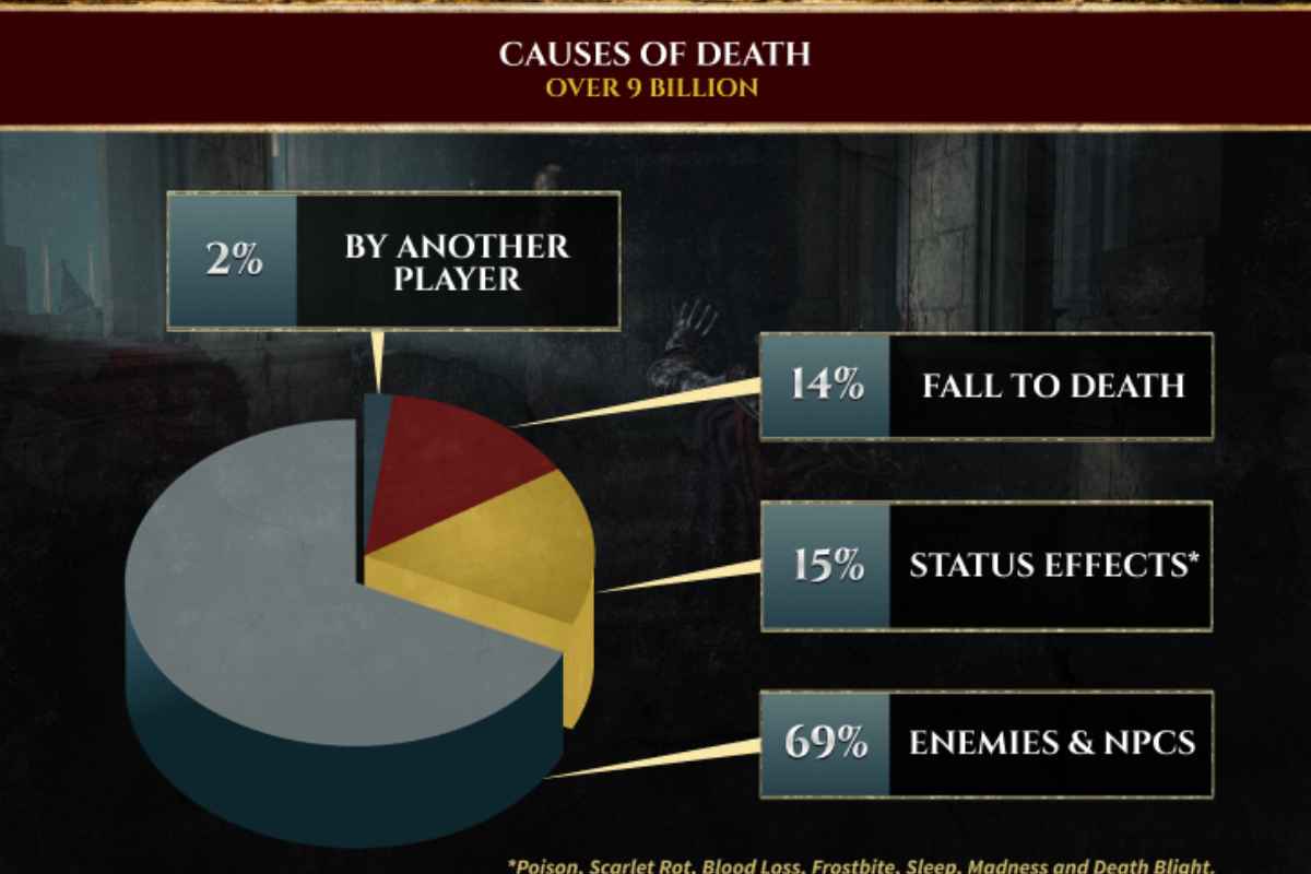 I giocatori di Elden Ring hanno incontrato una prematura dipartita digitale oltre 9 miliardi di volte e nel 69% dei casi è stata colpa di un nemico e di un npc, per il 15% dei casi una condizione che non è stata curata come per esempio l’avvelenamento o la follia. Il 2% è morto per mano di un altro giocatore ma la statistica più divertente è forse il fatto che il 14% dei giocatori è morto cadendo giù da altezze per le quali il loro corpo fatto di pixel non era progettato per resistere.