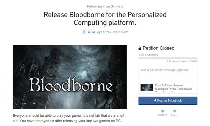 Circa un anno fa sul sito change.org è stata lanciata una raccolta di firme organizzata per chiedere la pubblicazione di Bloodborne anche in versione per PC. Come molti fan sanno infatti Bloodborne, sviluppato da From Software e pubblicato da Sony, è uscito come esclusiva per PlayStation 4, provocando lo scontento dei giocatori che prediligono il PC.