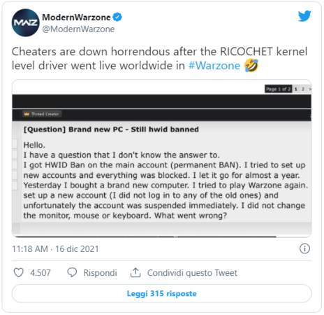 Come fa notare anche lo stesso profilo Twitter di ModernWarzone, una volta bannati i cheater non possono infatti accedere al gioco con un nuovo account. Questa è sicuramente un’ottima notizia, perché dopo vari tentativi, qualunque cheater potrebbe perdere la voglia di tornare in gioco sfruttando questi metodi.