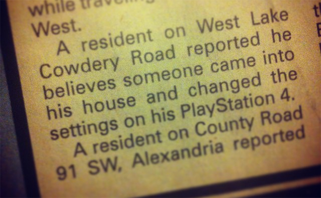 Un residente di Alexandria (Minnesota) ha contattato la polizia all’inizio del mese per segnalare l’intrusione di qualcuno che, entrando nell’abitazione, ha cambiato le impostazioni della sua PlayStation 4. Potete vedere anche un ritaglio dell’articolo di giornale in calce alla notizia.