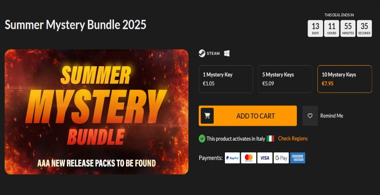 Parliamo del Mystery Bundle che, come suggerisce il nome, permette di comprare un tot di key senza sapere cosa si riceverà. Il bundle ha tre opzioni con un numero crescente di chiavi e un prezzo via via più alto. Ricordiamo intanto che ci sono grandi notizie per chi ama il mondo dei videogiochi.