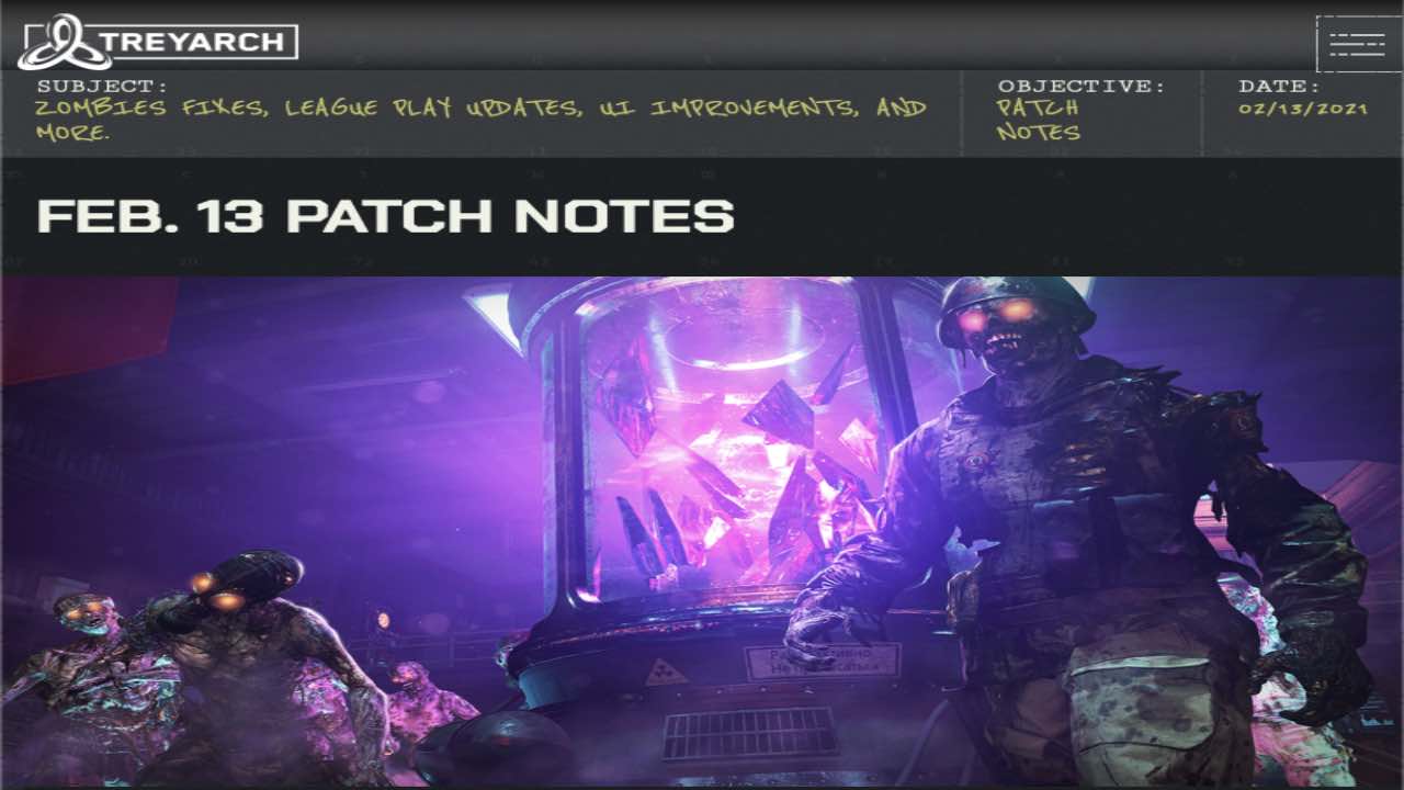 All’interno della modalità Zombies è stato risolto un problema che provocato lo spostamento del giocatore fuori dalla mappa nel momento in cui altri player stanno interagendo con il teletrasporto. È stato eliminato, anche, il trucco che dà l’opportunità al giocatore di restare sul Crafting. Inoltre anche la risoluzione del bug riguardo all’icona dell’aggiornamento dell’Arsenale, che molto spesso è disattivata in modo casuale. Infine è stata anche aggiunta un’icona stagioni all’interno delle sfide dedicate a Firebase Z. Scorrendo verso il basso, una foto ed il link della patch del 13 febbraio.