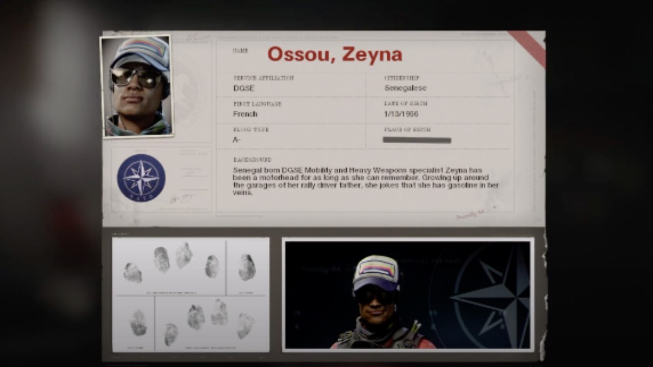 Zeyna, è un operatrice di origini senegalesi specializzata in armi pesanti e in mobilità. Essa, inoltre, non nasconde la sua passione riguardo i motori. Per dar a tutti la possibilità di inquadrare meglio questo personaggio, gli sviluppatori di Black Ops Cold War affermano che Zeyna, cresciuta nel garage di suo padre pilota di rally, afferma di avere benzina che gli scorre nelle vene. La giovane operatrice ama il rischio e questa propensione rappresenta sempre un’incognita nelle operazioni di infiltrazione. Tuttavia i suoi colleghi si fidano completamente delle sue capacità, che dimostra costantemente sul campo.