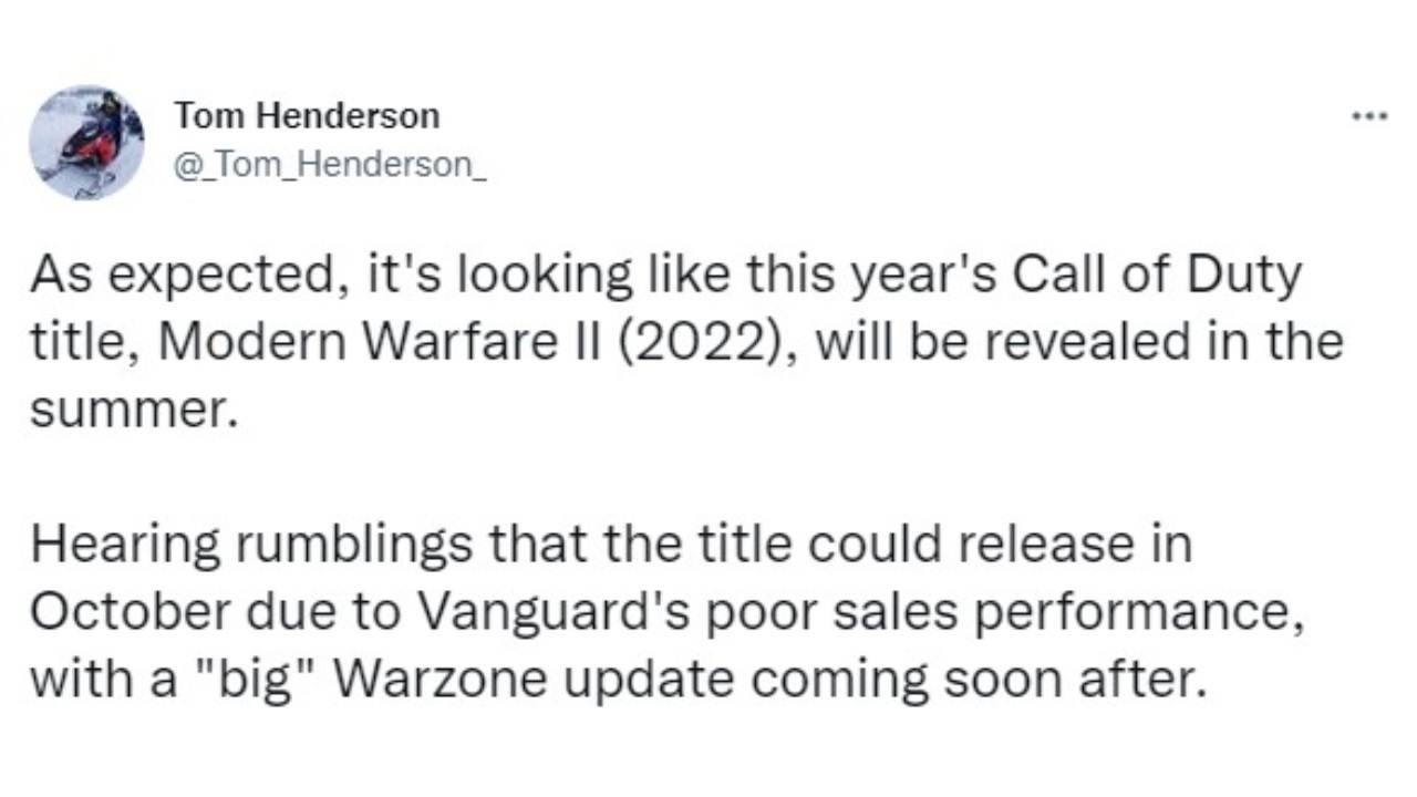 Il noto giornalista Tom Henderson ha voluto condividere con il popolo di Twitter una informazione che per metà non ci coglie impreparati: a quanto pare si sa già quando verrà presentato il nuovo Call of Duty, ovvero Modern Warfare 2 nella versione 2022. Nello stesso messaggio affidato al social dell’uccellino azzurro, però, il giornalista come suo solito ha unito quella che era una notizia abbastanza condivisibile con i suoi soliti rumor che molto spesso si rivelano poi esatti.