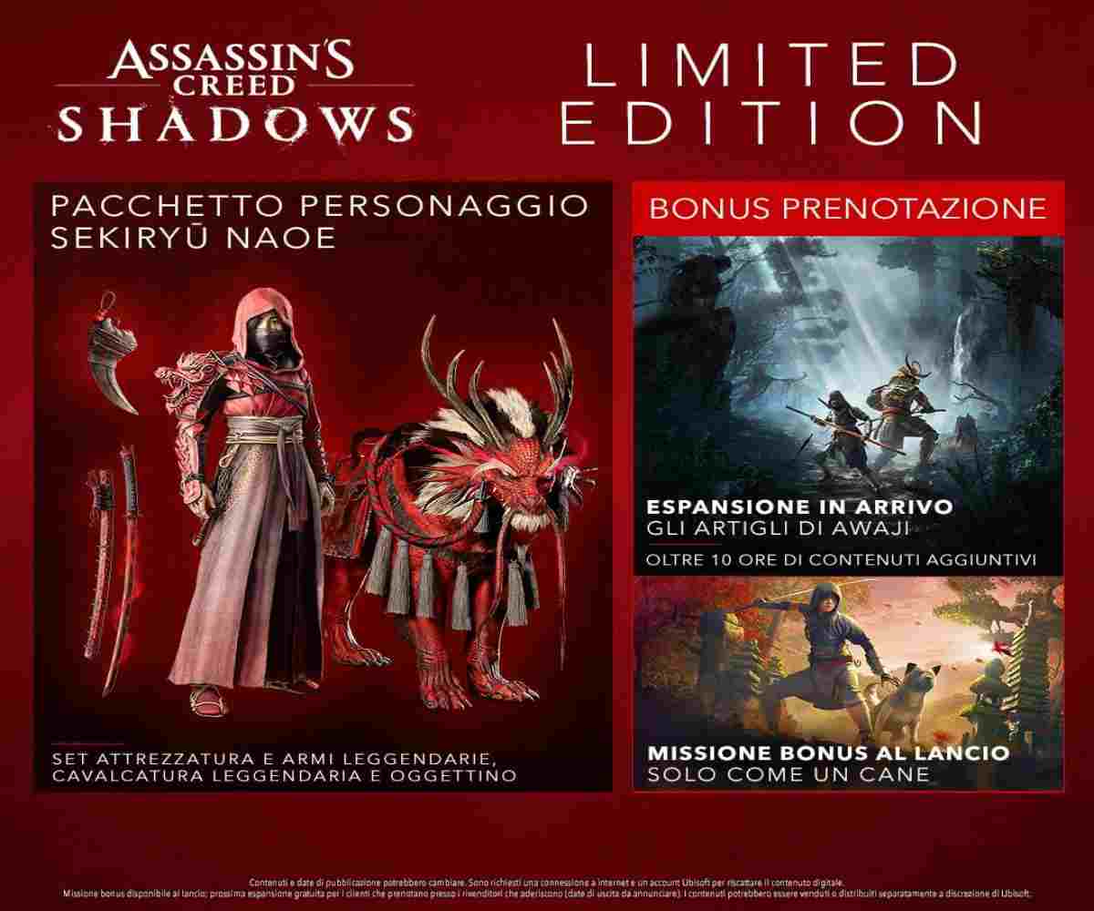 Per spingere quante più persone possibili a preordinare il videogioco segnaliamo che ci sono tanti bonus disponibili se si acquista già da ora il titolo. Non solo però, se si decide di acquistare il videogioco tramite Amazon allora si potrà accedere a un’edizione speciale del prodotto, ovvero Assassin’s Creed Shadows Limited Edition, che contiene un pacchetto aggiuntivo molto particolare.