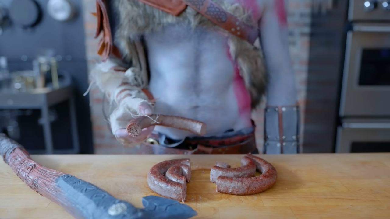 Fatto questo il macinato viene passato per una insaccatrice, rendendo così possibile creare delle salsicce mediante un budello. Le salsicce vengono quindi bucherellate e messe a cuocere su una griglia, all’aperto, tramite calore indiretto e poi direttamente sul fuoco. Alla fine lo stesso Babish, vestito da Kratos e con tanto di Leviatano, ne mangia un pezzo, prima di scomparire, ancora una volta in cerca di Atreus. Di seguito il video.