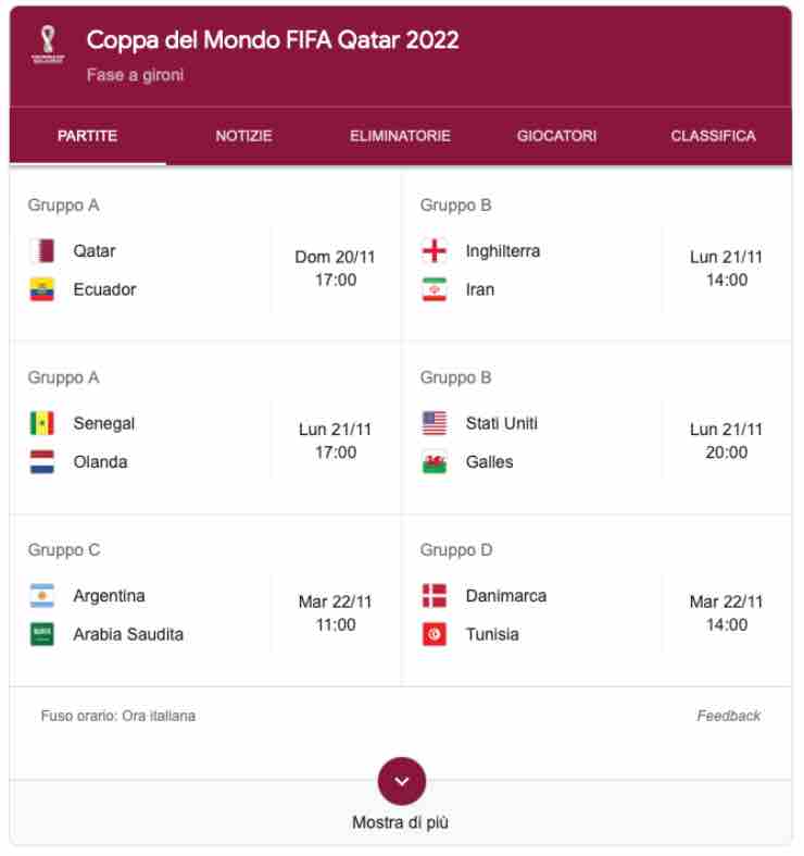 Ma quali sono quindi i passaggi per seguire da vicino tutti i match e non perdersi neanche un gol? Basterà andare su Google e digitale “Coppa del mondo“. A quel punto verrà generata una pagina contenente tutto il calendario delle partite in programma, le classifiche aggiornate, i marcatori e tutto ciò che consegue una Coppa del Mondo. Dopodiché sarà possibile selezionare una squadra preferita e attivare la campanella, grazie alla quale potrete ricevere sullo smartphone, in diretta, tutti gli aggiornamenti legati a quella nazionale specifica.