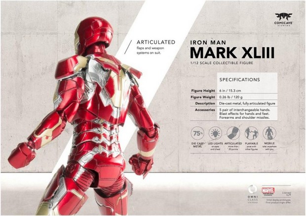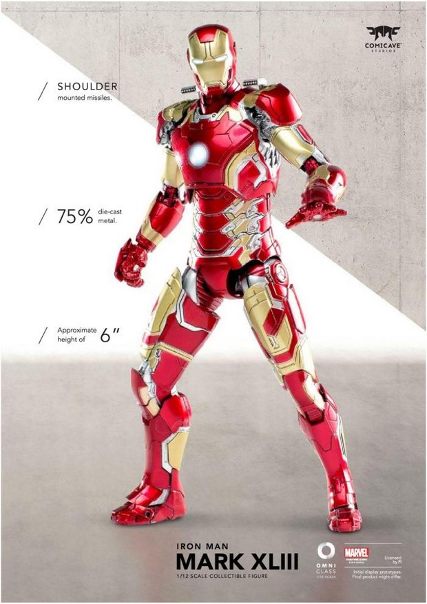 La prima action figure della nuova serie sarà la stupenda Iron Man Mark XLIII 43 da “Avengers: Age of Ultron”. Il materiale utilizzato per fabbricarla è al 75% da metallo die-cast con ben 20 punti di articolazione per una scala di 1:12, altezza 15,3 cm. e peso di 120 gr. Inoltre sarà dotata di luci a LED nel reattore Arc e negli occhi. Come accessori troviamo : un paio di missili per le spalle, un missile per l’avambraccio, mani addizionali oltre che effetti per i piedi e le mani. La Iron Man Mark XLIII 43 Omni Class sarà in vendita a circa 110 $/100 € (tasse locali escluse) con uscita prevista per Maggio 2016.