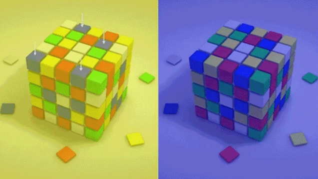 Ecco ora un cubo di Rubik che potrebbe ricordare in qualche modo il gioco del vestito (bianco&oro o blu&nero?) popolare poco tempo fa. In questo caso, nonostante pensiate di vedere dei riquadri blu o gialli, non è detto che sia così… “I colori che vediamo sono costruiti interamente dal nostro sistema di percezione“, spiega Abrash.