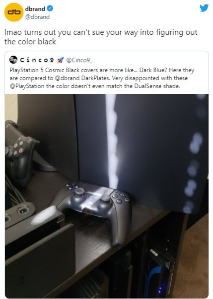 Ovviamente Dbrend non ha perso l’occasione per attaccare ancora una volta Playstation. Infatti, condividendo una delle tante immagini di utenti che sottolineano come le cover PS5 ufficiali Midnight Black non siano così tanto black, l’azienda ha scritto: “Sembra che tu non possa capire il colore nero attraverso le cause legali“. Come quella che potrebbe avere per protagonista Red Dead Redemption 2.