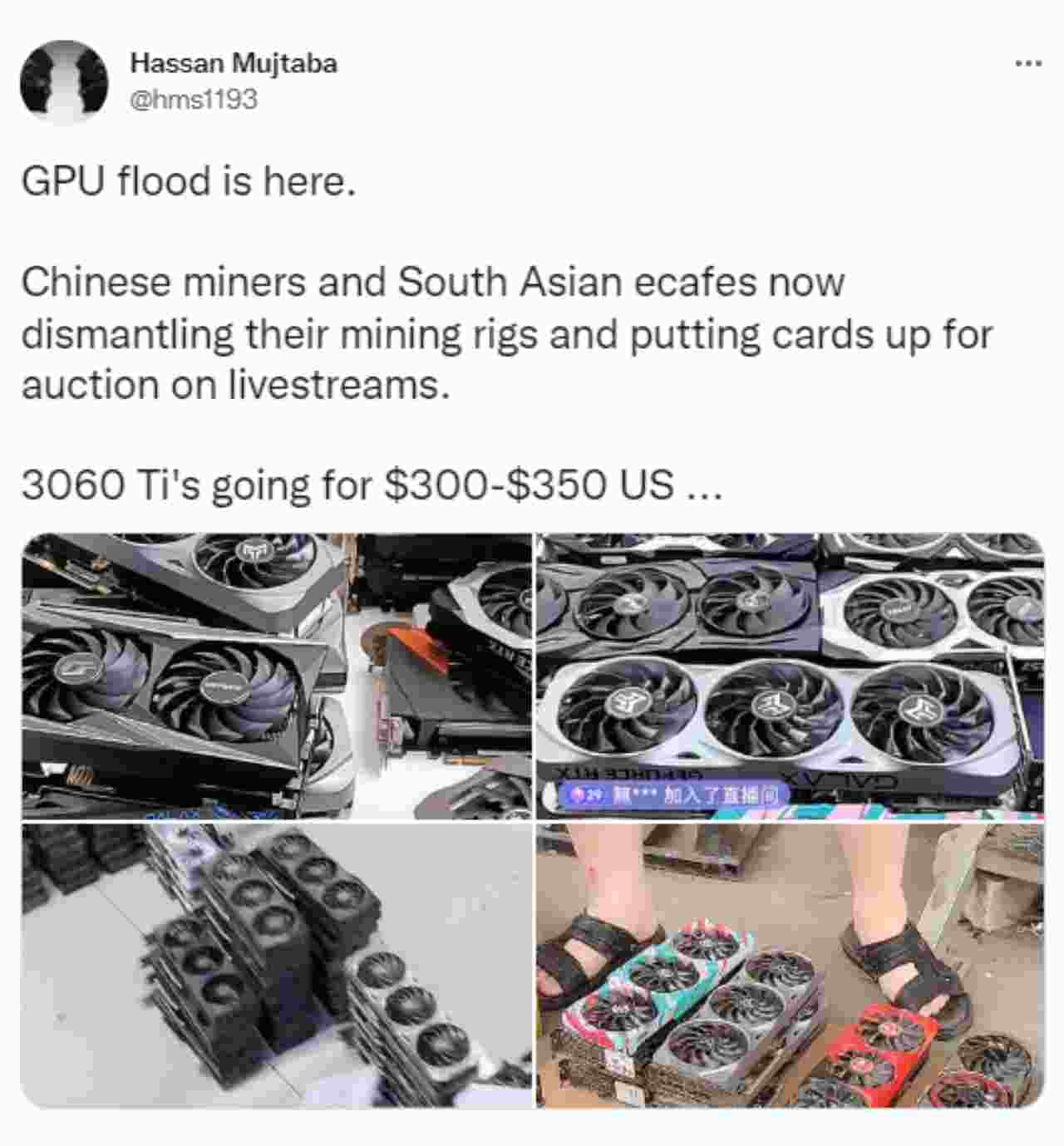 A segnalare questo che possiamo definire come un primo movimento tellurico sono i ragazzi di videocardz che segnalano come ci siano internet cafè e miner che ormai vendono all’asta in diretta sui social le proprie schede grafiche per cercare in qualche modo di rifarsi delle spese.