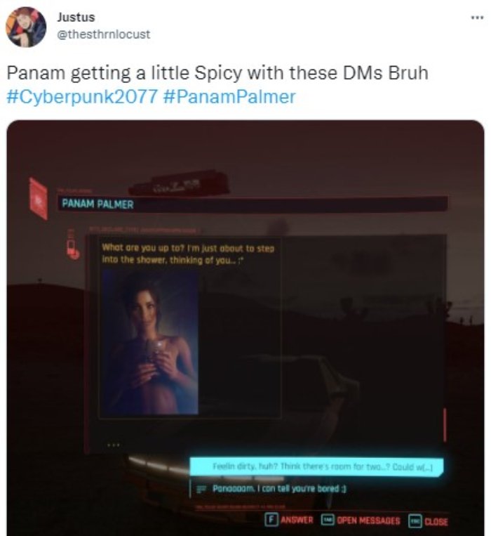 Tra le tante aggiunte che ha portato l’aggiornamento 1.5, c’è un qualcosa di davvero particolare. Parliamo infatti di un tipo di messaggi piuttosto piccanti che i videogiocatori stanno ricevendo sul proprio cellulare in questi giorni. Tutto è iniziato con un utente che, mentre esplorava la città con V, ha ricevuto un messaggio piuttosto spinto da Panam, uno dei personaggi più apprezzati del titolo e senza dubbio tra quelli che più spesso vengono scelti per le romance.